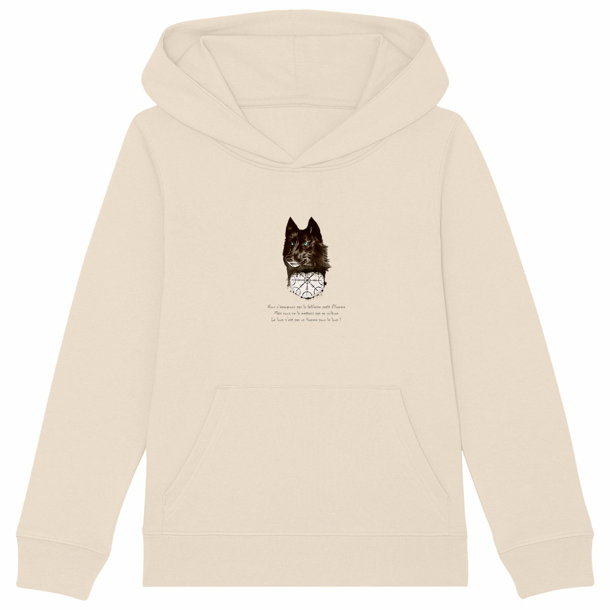 Détails du modèle pour les non-voyants : loup noir et motif indien dans un cercle rappelant la visée du fusil du chasseur.